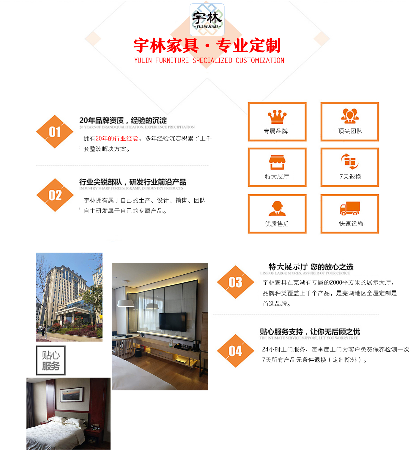 蕪湖宇林工貿(mào)有限公司創(chuàng)建于1996年,位于蕪湖高新技術(shù)開發(fā)區(qū)南區(qū),占地面積13000余平方米。是一個集研發(fā)、設(shè)計為一體的綜合性公司,公司主營整體家居定制、酒店家具定制、娛樂場所配套家具以及軟體系列,團隊,銳意革新、進去不息的理念,逐漸成為蕪湖家具行業(yè)的生產(chǎn)廠家,并在2006年注冊了“宇林”牌商標(biāo)。宇林品牌家具依現(xiàn)代與古典相結(jié)合的多種實木家具、實木貼皮家具。家具做工精細,多用人工雕刻;其自然、典雅的風(fēng)格在很大程度上引導(dǎo)著人...